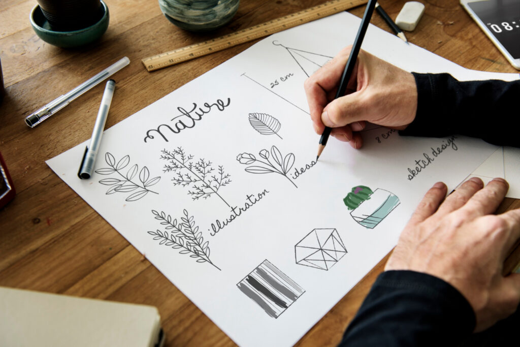 Gdy podstawowe informacje są już zebrane, zaczyna się etap eksploracji pomysłów. Szkicowanie to moment, w którym projektant pozwala sobie na swobodę twórczą, testując różne formy i układy. To czas eksperymentów – od minimalistycznych ikon po bardziej złożone kompozycje.