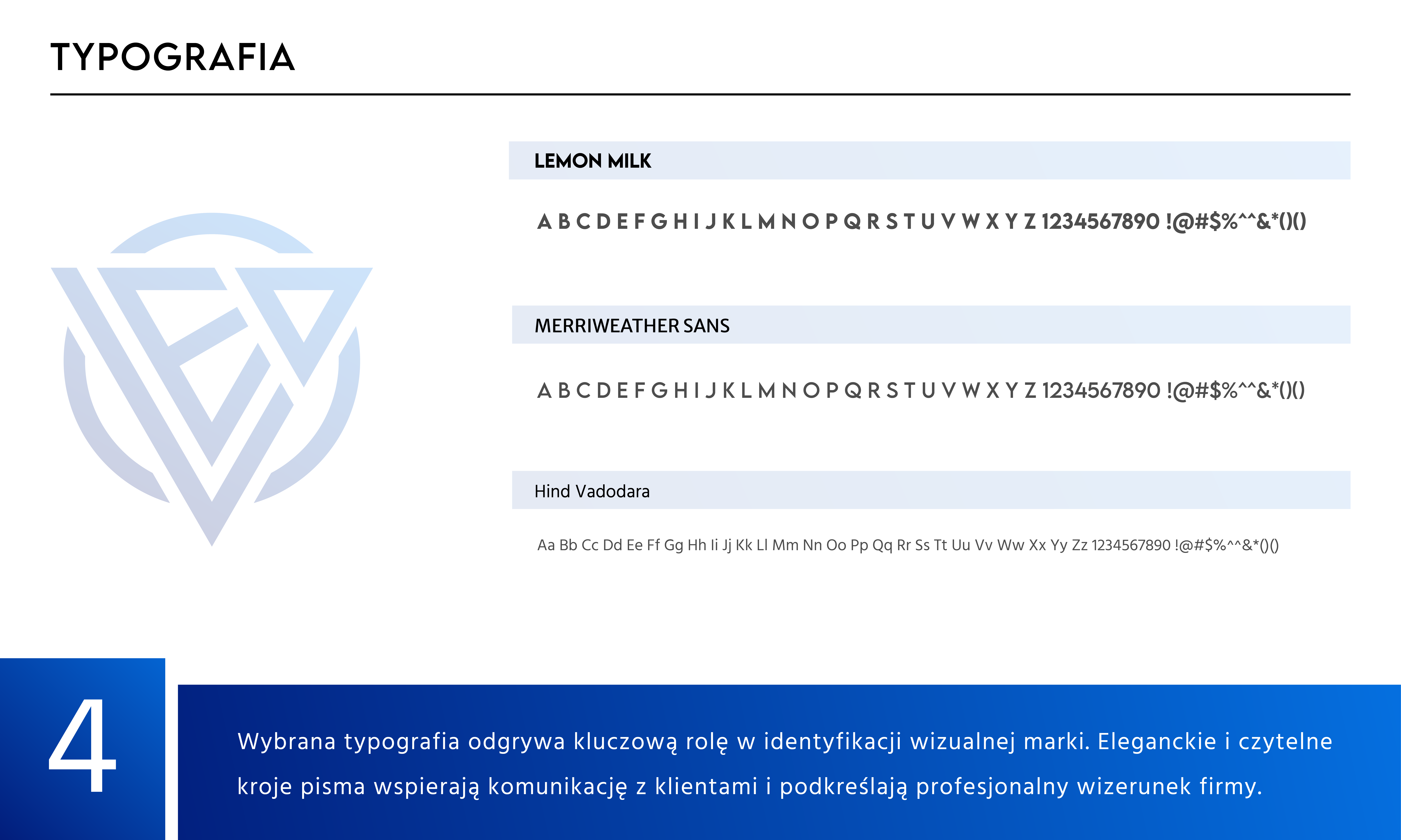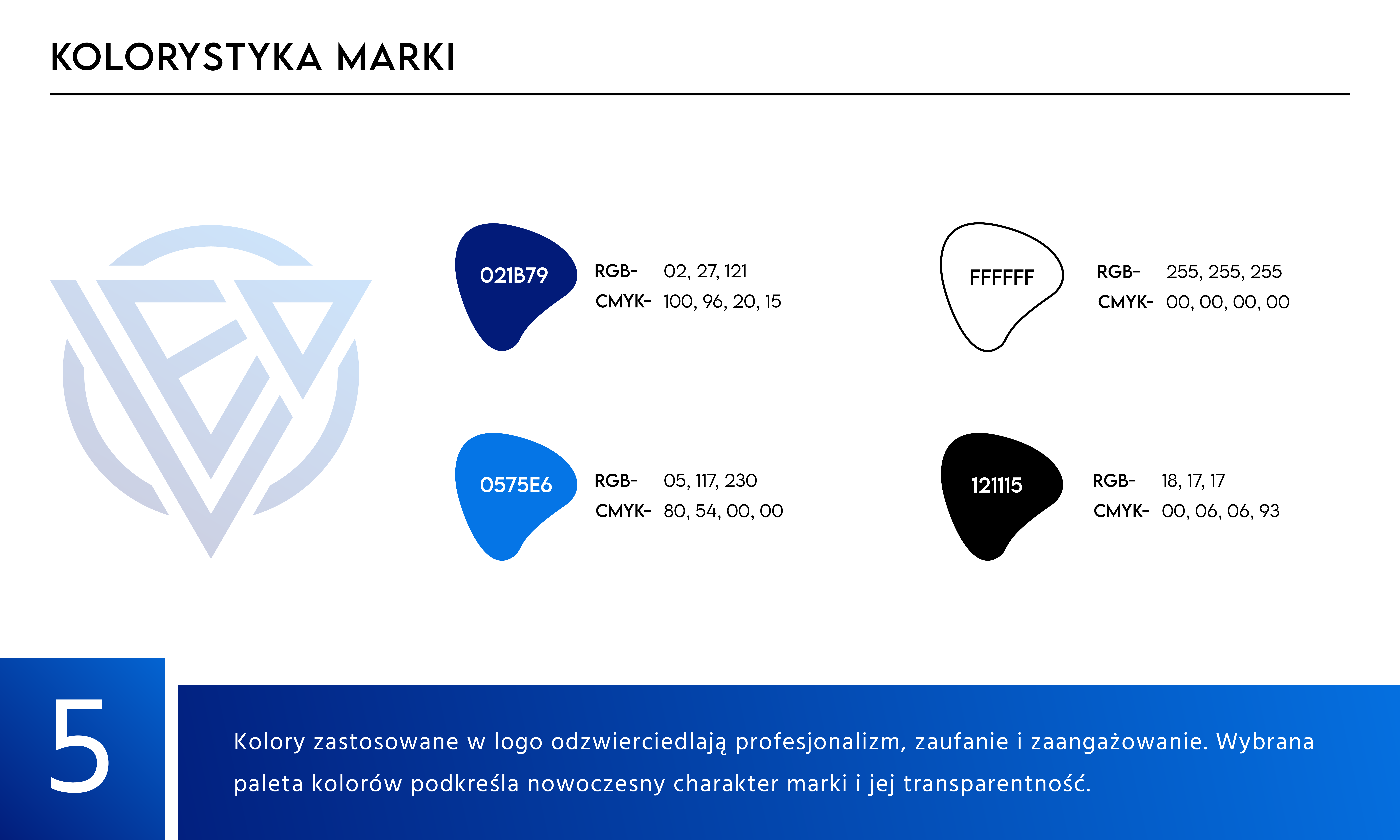 Kolorystyka marki oparta jest na odcieniach niebieskiego, co symbolizuje zaufanie, profesjonalizm i stabilność, oraz białym i czarnym, które podkreślają nowoczesność i uniwersalność. Zastosowanie tych barw gwarantuje spójność wizualną w każdej formie komunikacji.