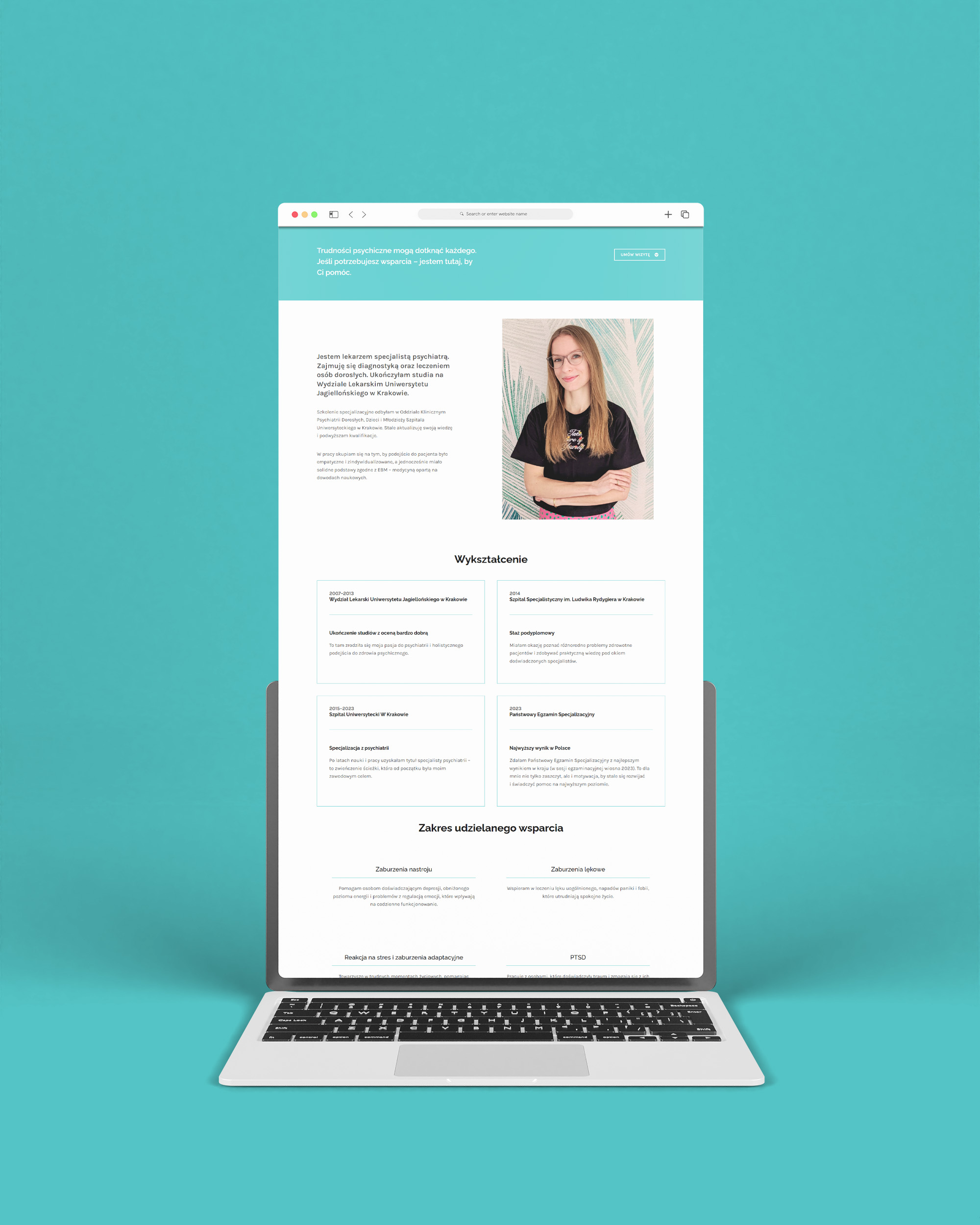 Projekt logo i strony internetowej dla Karoliny Kutyły-Jaworskiej – specjalisty psychiatry – powstał z myślą o stworzeniu wizerunku, który odzwierciedla spokój, profesjonalizm i wrażliwość na drugiego człowieka.